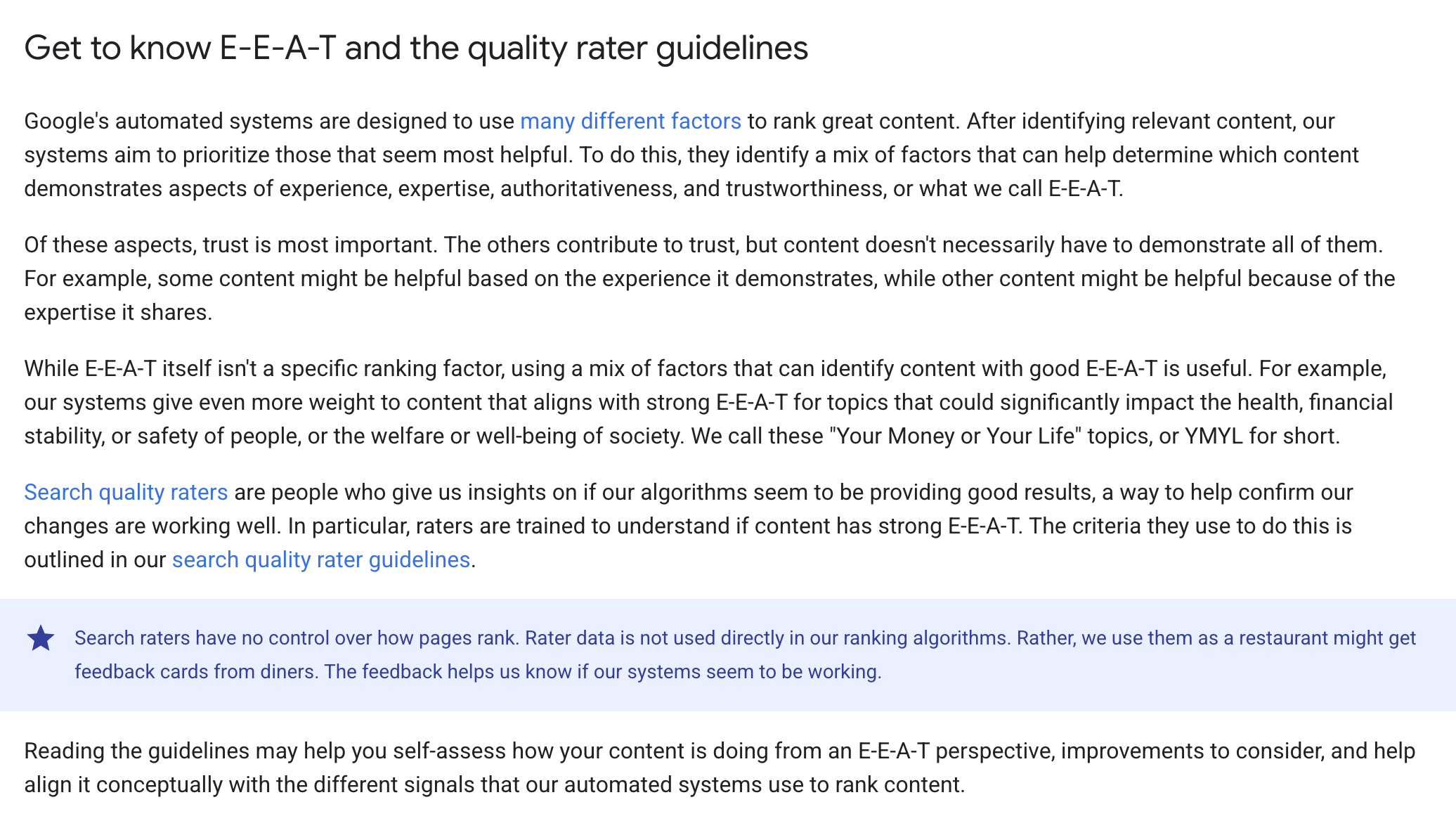 E-E-A-T stands for Experience, Expertise, Authoritativeness, and Trustworthiness. It's not a direct ranking factor in the way backlinks or page speed are, but it's part of how Google's Search Quality Raters evaluate content—and those evaluations shape the algorithm.