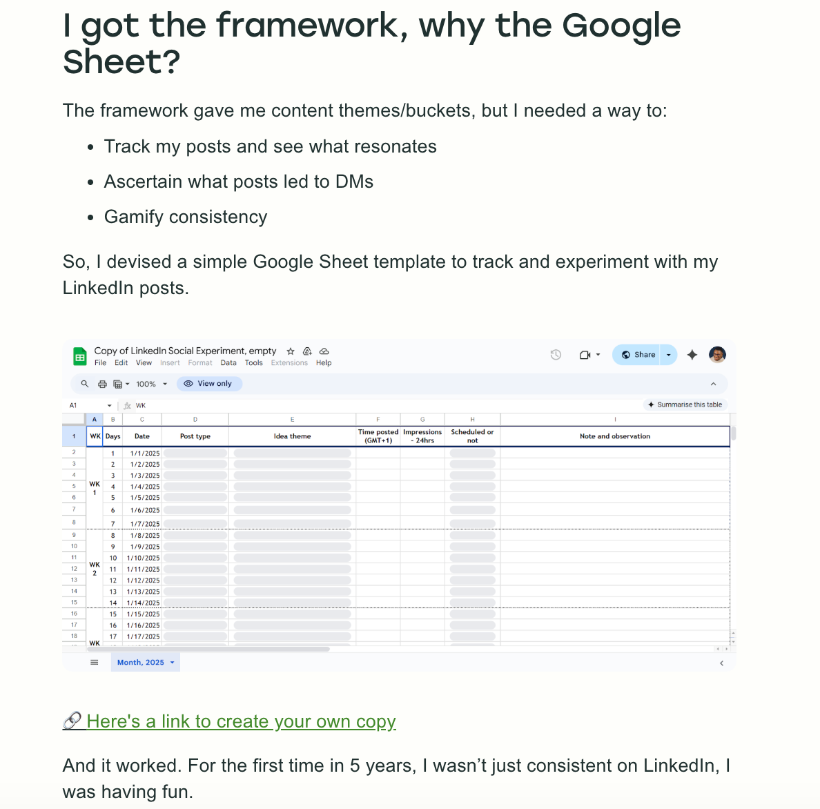 In practice: Take this example from Ash Read, who wrote about his LinkedIn consistency struggle on Buffer. He didn't just give generic advice — he shared his own experience and included the actual Google Sheet framework he built to track what resonated.