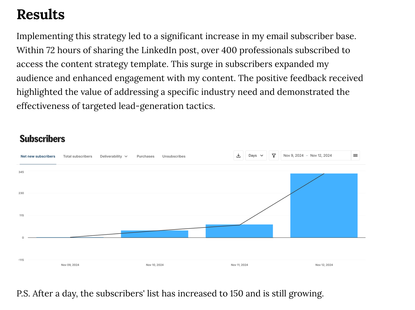 In practice: Last year, I wrote an article on how I got 400+ subscribers in three days. That post wasn't generic advice — it was based on what actually happened, how I did it, and what the results were. Readers could see the exact steps I took, the timeline, and the outcome. That's what separates content that ranks from content that gets ignored.